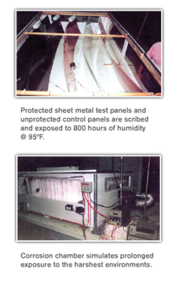 Test Methodology: Test conformed with ASTM Standard D1654 Four separate automotive sheet metal panels, each measuring 7 feet x 15 inches Each panel scribed to bare metal One panel connected, other three not connected 35 days (800 hours) of exposure in corrosion chamber